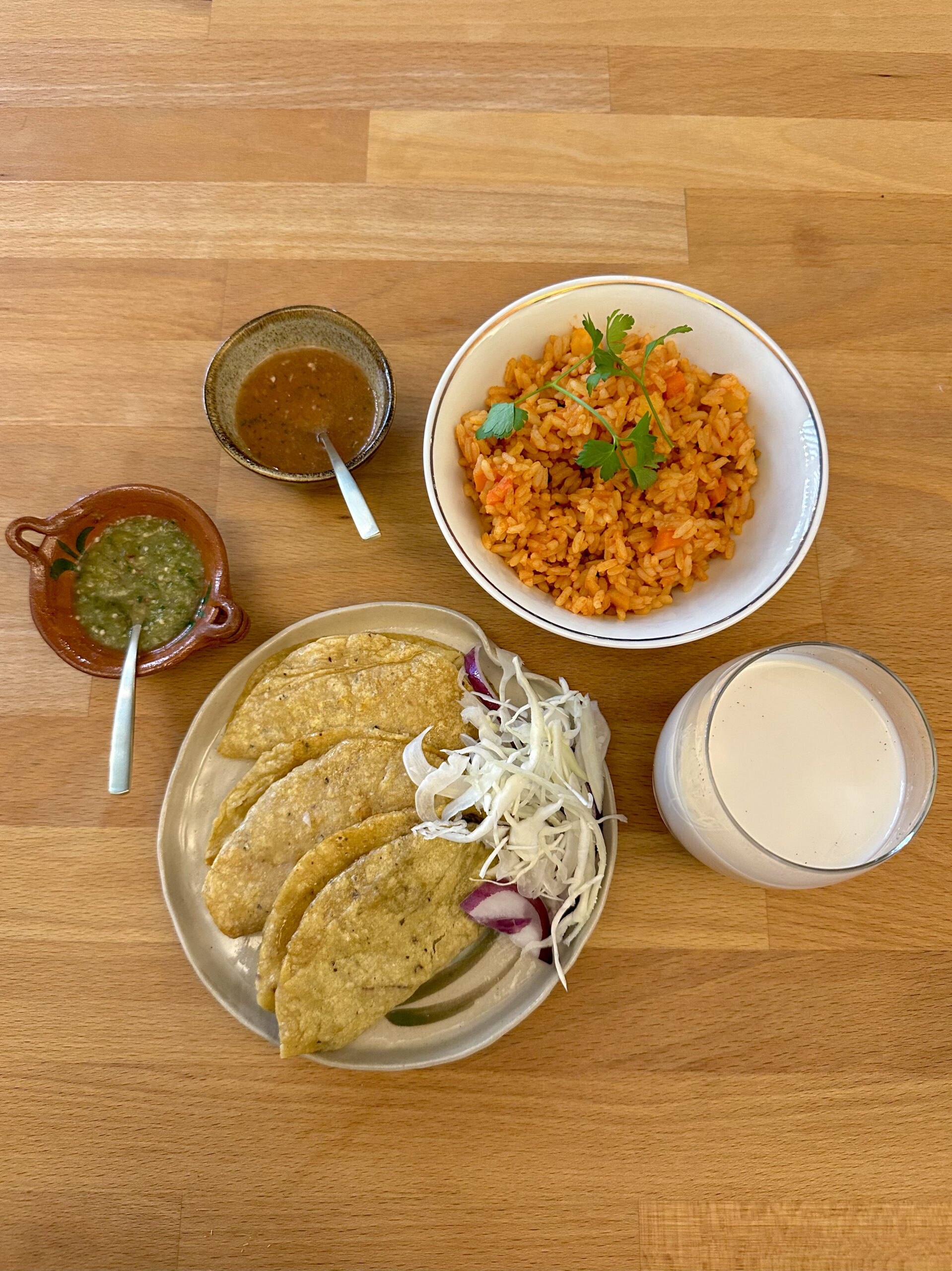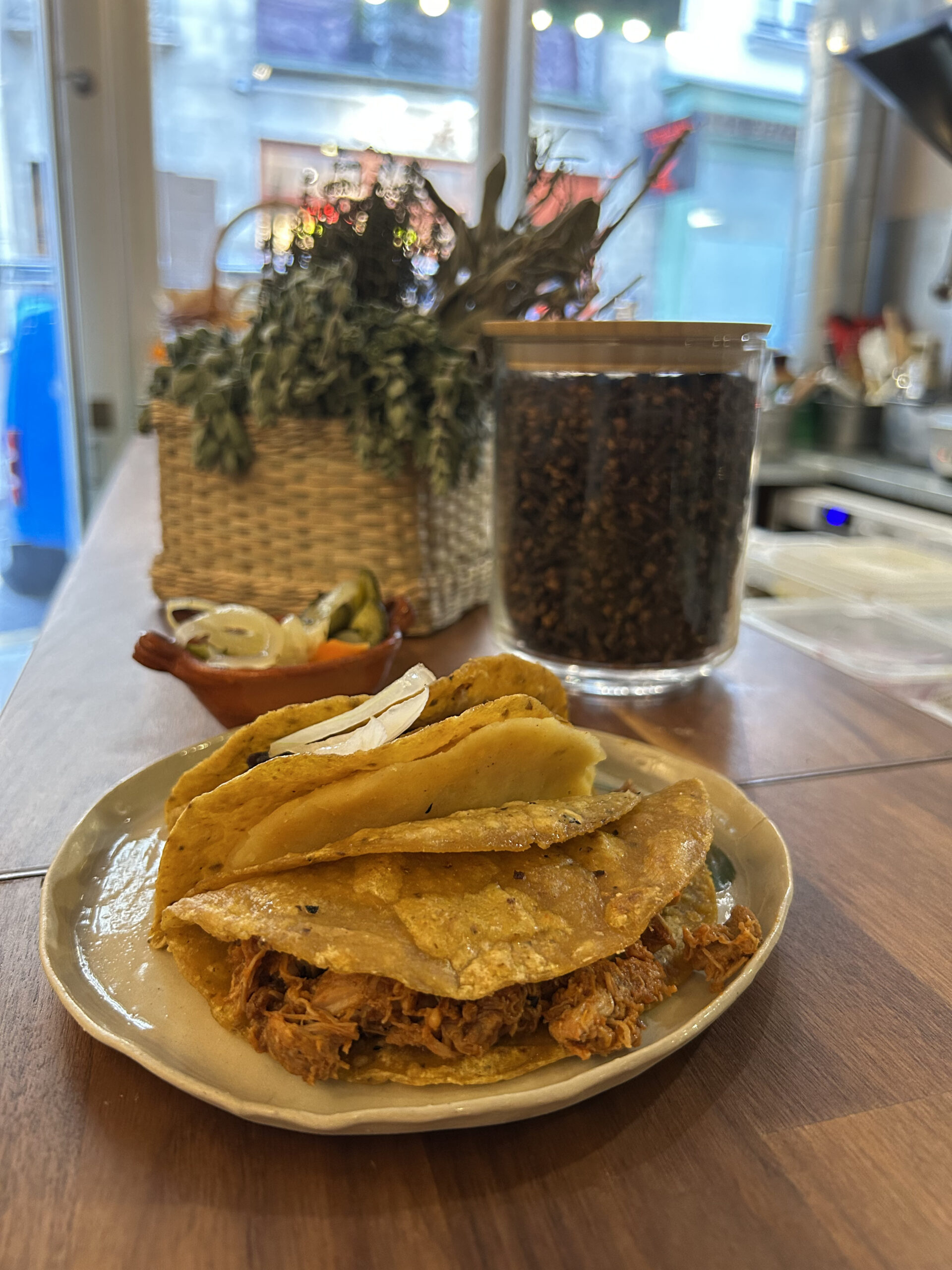 • Plats principaux : Tacos de Canasta (Pommes de terre, haricots rouges, poulet pibil, chorizo rouge, Birria de bœuf…)